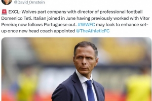 緊隨主帥佩雷拉步伐,奧恩斯坦:狼隊總監(jiān)多梅尼科-泰蒂離職