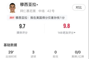 體育資訊6月16日訊 世俱杯小組賽首輪,拜仁10-0奧克蘭城,穆西亞拉替補(bǔ)出戰(zhàn),球員此役數(shù)據(jù)如下: