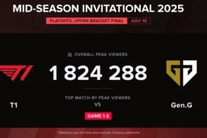 體育資訊7月10日訊 外媒數(shù)據(jù)統(tǒng)計媒體發(fā)布2025季中冠軍賽T1對陣GEN第二局觀眾峰值數(shù)據(jù),本局比賽觀眾峰值達(dá)到了1824288。