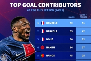 體育資訊7月11日訊 德國轉(zhuǎn)會市場列出了本賽季巴黎隊(duì)內(nèi)參與進(jìn)球榜,登貝萊52場參與51球居首,巴爾科拉參與42球次席。