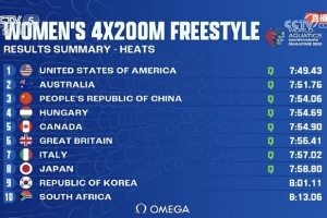 世錦賽女子4x200米自由泳接力預(yù)賽:中國(guó)隊(duì)排名第三晉級(jí)決賽