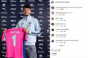 特拉福德曬出自己手持曼城1號球衣的簽約亮相照,并配文:“回到了我所屬的家。”