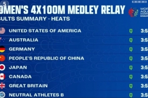 新加坡游泳世錦賽今天上午進(jìn)行了女子4x100米混合泳接力預(yù)賽,由萬樂天、楊暢、余依婷、吳卿風(fēng)組成的中國(guó)隊(duì)游出3:56.70的成績(jī),最終排名小組第三總成績(jī)第四,成功晉級(jí)決賽。排在預(yù)賽前三位的是美國(guó)隊(duì)、澳大利亞隊(duì)和德國(guó)隊(duì)。