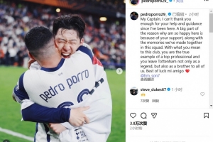 體育資訊8月4日訊 熱刺隊(duì)長孫興慜確定離隊(duì),預(yù)計(jì)將前往美職聯(lián)加盟洛杉磯FC。對(duì)于這樣的球隊(duì)傳奇離開,熱刺后衛(wèi)波羅在社交媒體上進(jìn)行了告別。