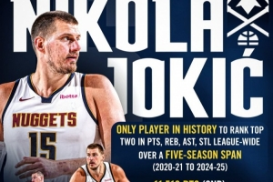 據(jù)統(tǒng)計,約基奇在2020-21賽季至2024-25賽季這5個賽季中,總得分、籃板、助攻和搶斷數(shù)都排名聯(lián)盟前二!他也是歷史唯一一人!具體數(shù)據(jù)如下: