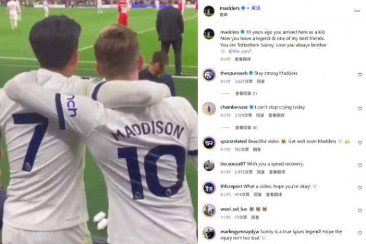麥迪遜在社媒中曬出了自己與孫興慜合集片段,并配文:“10年前你來到這里是還是一個(gè)孩子?,F(xiàn)在你作為傳奇&我的朋友的身份離開。你就是托特納姆孫尼。永遠(yuǎn)愛你兄弟?!?/p>