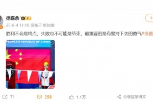 徐嘉余寫道:勝利不會是終點,失敗也不可能是結束,最重要的是有堅持下去的勇氣。