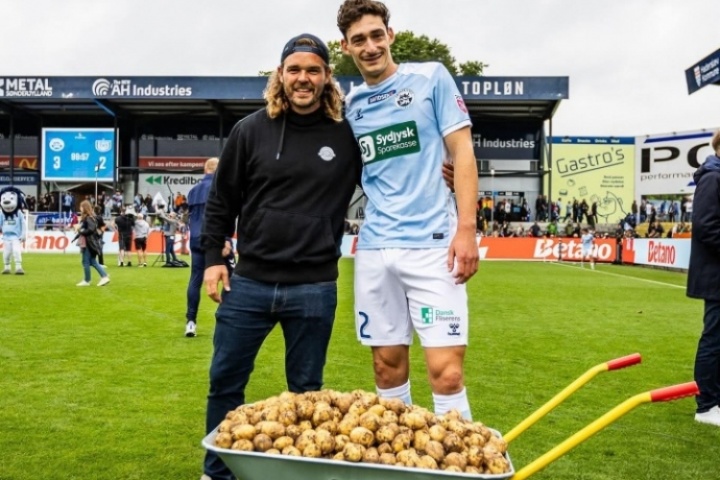【戰(zhàn)利品55kg土豆??】 ????丹麥超級聯(lián)賽S?nderjyske在3-2戰(zhàn)勝FC Nordsj?lland的比賽中,全場最佳球員的獎品是一整袋55kg的土豆!