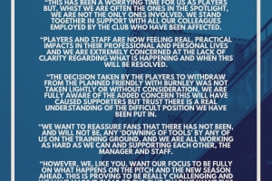球員決定退出原定與伯恩利的友誼賽,并非草率之舉或缺乏考量。我們完全清楚這會增加球迷的不安情緒,但我們相信,大家能夠理解我們所處的艱難境地。
