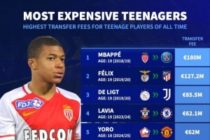 體育資訊8月5日訊 德國(guó)轉(zhuǎn)會(huì)市場(chǎng)統(tǒng)計(jì)了足壇歷史U20球員(不包含20歲)的轉(zhuǎn)會(huì)費(fèi),并列出榜單,姆巴佩、菲利克斯、德里赫特排名前三。