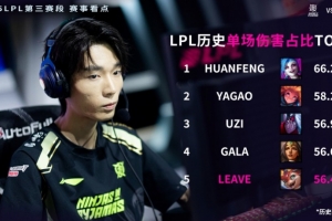 體育資訊8月5日訊 LPL單場(chǎng)傷害占比排名:Huanfeng金克絲占比66.2%第一,Yagao佐伊58.2%占比第二,Uzi韋魯斯占比56.92%第三.