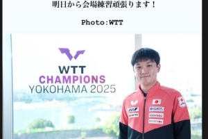 張本智和寫道:因為開往橫濱的電車中途停了,延誤了,所以沒能參加抽簽儀式。如今平安到達橫濱,接下來開始在會場練習加油。