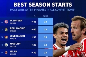 德轉(zhuǎn)列五大聯(lián)賽球隊(duì)開(kāi)局14場(chǎng):拜仁全勝,皇馬曼城米蘭等隊(duì)均13勝