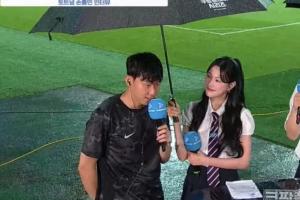 隨著爭議蔓延,有網(wǎng)友拍到另一個角度的現(xiàn)場照片。照片中孫興慜右手也拿著麥克風(fēng),因此無法撐傘。