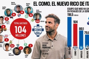 體育資訊8月6日訊 據(jù)西媒《阿斯報(bào)》發(fā)文表示,法布雷加斯執(zhí)教的科莫今夏已經(jīng)花費(fèi)1.04億歐簽下10名新球員,轉(zhuǎn)會(huì)支出僅次于尤文,位列意甲第二多。在印尼富豪的支持下,科莫正在成為意甲的一支重要力量。