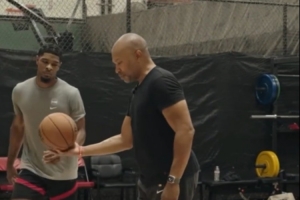 亨德森接受“老魚”費舍爾特訓指導,費舍爾直接脫掉球鞋,給亨德森講解投籃時的腳步姿勢。