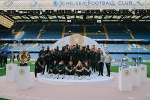 三冠王女隊的成員們,包括隊長米莉-布賴特,首先帶著女足英超冠軍獎杯、聯賽杯和足總杯出場,隨后整個男隊帶著世俱杯和歐協聯獎杯加入她們。