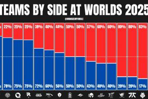 外媒統(tǒng)計S賽各隊紅藍(lán)占比:GEN藍(lán)色占比80%;T1紅色占比86%