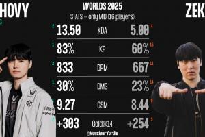 Chovy-Zeka本次世界賽數(shù)據(jù)對比:Chovy所有數(shù)據(jù)均領(lǐng)先Zeka