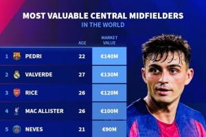 中場中路球員身價排名:佩德里1.4億歐居首,巴爾韋德、賴斯前三