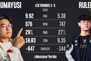 體育資訊8月7日訊 今日外媒Monsieur Yordle發(fā)布了2025 LCK第3-5輪中Gumayusi與Ruler數(shù)據(jù)對(duì)比,其中包括KDA、分均輸出、輸出占比、分均補(bǔ)刀、14分鐘對(duì)位經(jīng)濟(jì)差,Gumayusi五項(xiàng)數(shù)據(jù)全面領(lǐng)先Ruler。