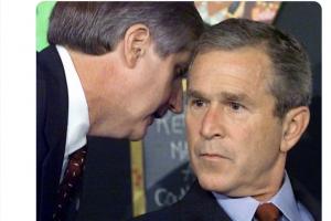 該圖片中,時(shí)任前白宮辦公廳主任安德魯-卡德告知時(shí)任美國(guó)總統(tǒng)小布什:“先生,第二架飛機(jī)撞上了二號(hào)大樓?!?/p>