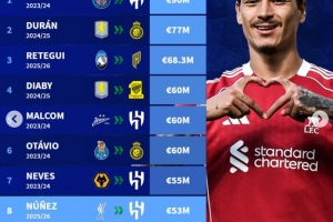 8.努涅斯 2025/26賽季 從利物浦加盟利雅得新月 5300萬歐