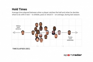 體育資訊8月11日訊?數(shù)據(jù)專家Todd Whitehead統(tǒng)計(jì)了上賽季,進(jìn)攻發(fā)起者在接到球之后,做出下一步行動(dòng)(運(yùn)球、傳球或投籃)所用的平均時(shí)間,具體如圖。