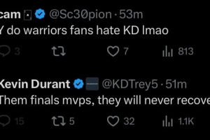 網(wǎng)友A:“勇士球迷真的恨KD啊,哈哈?!?/p>