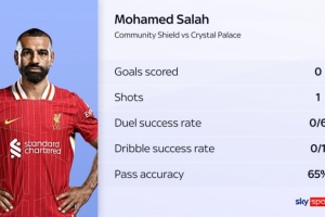 據(jù)天空體育統(tǒng)計,薩拉赫本場比賽傳球成功率65%,所有非門將首發(fā)球員中最低,而且他在一周內(nèi)第二次罰丟點球。