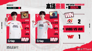 體育資訊8月12日訊?2025LPL第三賽段常規(guī)賽組內(nèi)賽,WBG 2-1 WE,WBG輔助Crisp斬獲兩局MVP。