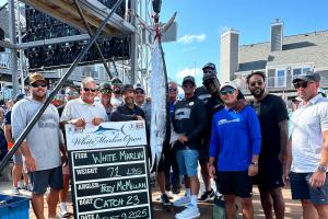 喬丹帶著二兒子馬庫(kù)斯一起參加,捕獲最大的魚仍是10號(hào)那天的71磅(32公斤)白馬林魚。