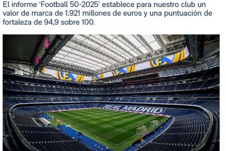 根據(jù)品牌評估機構(gòu)Brand Finance發(fā)布的《Football 50-2025》年度報告,皇家馬德里連續(xù)第二年成為全球最具價值足球品牌,并連續(xù)第四年保持全球最強足球品牌地位。我俱樂部品牌價值增長14%,創(chuàng)下19.21億歐元的新紀錄。