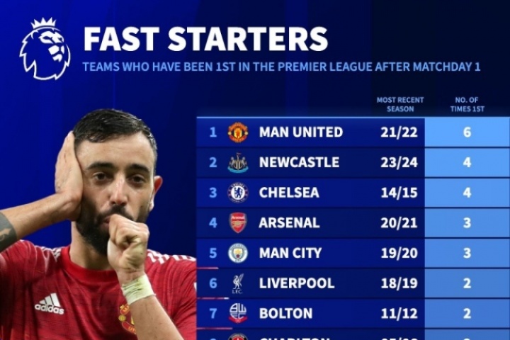 體育資訊08月15日訊 新賽季英超開賽在即,德轉(zhuǎn)列出了哪些球隊(duì)在英超第一輪后占據(jù)榜首的次數(shù)最多,曼聯(lián)以6次排名第一。