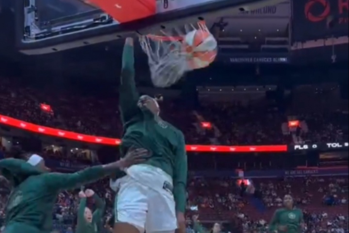 本場比賽賽前訓(xùn)練時,風(fēng)暴隊(duì)榜眼秀、法國1米98中鋒馬隆加輕松起飛完成扣籃。
