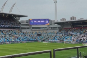 視頻顯示,津門虎主場大屏幕打出了“歡迎大連英博球迷!”的字樣。
