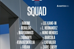 前鋒:7-克瓦拉茨赫利亞、9-貢薩洛-拉莫斯、10-登貝萊、14-杜埃、19-李剛仁、29-巴爾科拉、49-姆巴耶