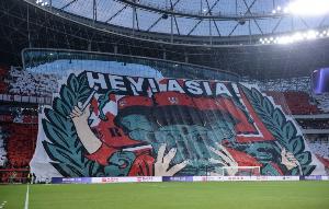 此前,浦和紅鉆就以內(nèi)容豐富、面積巨大的Tifo文化著稱(chēng),被稱(chēng)為“亞洲第一主場(chǎng)”。3月和6月的18強(qiáng)賽,印尼隊(duì)在容量7.7萬(wàn)人的雅加達(dá)球場(chǎng)展示了巨大Tifo,文化輸出方面同樣令人印象深刻:對(duì)巴林時(shí)Tifo畫(huà)面是象征印尼民族傳統(tǒng)文化的金色迦樓羅神鳥(niǎo),整個(gè)Tifo覆蓋了兩層看臺(tái);對(duì)國(guó)足時(shí)Tifo展現(xiàn)的是印尼神話英雄迦多鐸卡伽形象,他左手持繪有迦樓羅的盾牌,右手舞刀沖破城堡,象征印尼的強(qiáng)大力量。