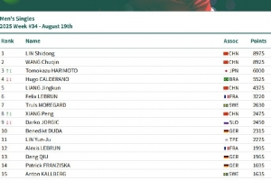 男單方面,林詩(shī)棟排名第一,王楚欽排名第二,張本智和排名第三,巴西選手雨果-卡爾德拉諾排名第四,梁靖崑排名第五,小勒布倫排名第六,莫雷加德排名第七,向鵬排名第八,達(dá)科排名第九,杜達(dá)排名第十。