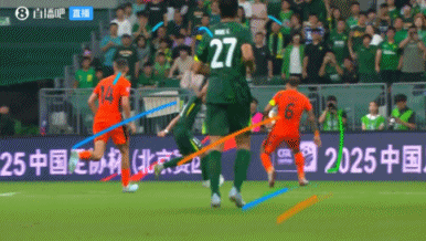 比賽第45分鐘,林良銘進攻中在玉昆禁區(qū)內(nèi)倒地,裁判判給國安一個角球。