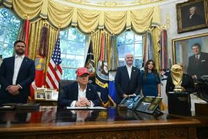 副總統(tǒng)JD-萬斯(左一)、國際足聯(lián)主席詹尼-因凡蒂諾(右二)及國土安全部長克里斯蒂-諾姆(右一)共同見證此次公告。