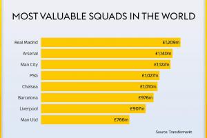 體育資訊08月23日訊 英國天空體育援引德轉(zhuǎn)數(shù)據(jù),列出了全球俱樂部球員總身價排名,皇馬以超12億鎊的身價位居首位。