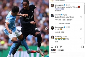 此役熱刺邊衛(wèi)斯賓塞踢滿全場(chǎng),幫助球隊(duì)取勝,賽后他在社交媒體上曬出比賽照片,并配文:“讓你們最喜歡的邊鋒放馬過(guò)來(lái)!”展現(xiàn)自己不懼對(duì)抗的自信。