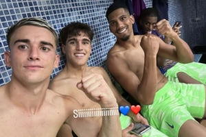 加維賽后更新社媒動態(tài),曬出與阿勞霍、庫巴西在更衣室的合照,慶祝球隊取勝。