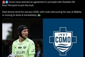 體育資訊8月25日訊 據知名轉會專家羅馬諾報道,科莫已經與瑞典門將諾埃爾-托爾奎斯特達成原則性一致。