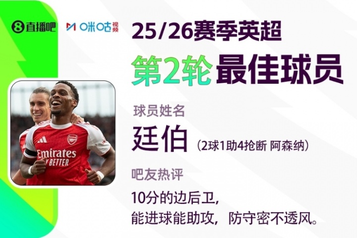 體育資訊8月27日訊 2025-2026賽季英超火熱進行中,體育資訊和咪咕體育聯(lián)合發(fā)起每輪英超最佳球員評選活動!第二輪評選結果結出爐,阿森納后衛(wèi)廷伯2球1助4搶斷,攻守兼?zhèn)涞乃@得吧友近四萬吧友的投票支持,以較大優(yōu)勢當選 【體育資訊X咪咕體育英超第2輪最佳球員】!