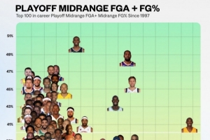 體育資訊8月27日訊 今日,數(shù)據(jù)媒體NBA University曬出一張自從1997年以來聯(lián)盟季后賽中距離投籃出手次數(shù)前100球員的命中率分布圖。