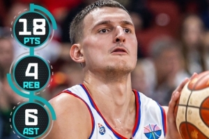 此役,塞爾維亞新星約維奇出戰(zhàn)三節(jié),登場(chǎng)15分51秒,投籃8中6,三分4中3,罰球3中3,得到18分4板6助1斷,正負(fù)值+36。