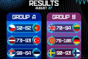 體育資訊8月28日訊 男籃歐錦賽首日六場比賽結(jié)束,全部賽果如下: