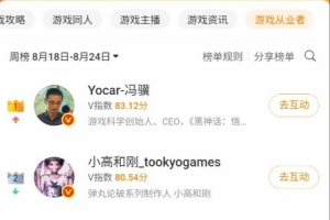 據(jù)微博V影響力榜“游戲從業(yè)者”類別的名單顯示,在8月18日至8月24日這一周里,《黑神話》系列制作人馮驥登上了第一名,V指數(shù)為83.12分,超越了《彈丸論破》系列制作人小高和剛(V指數(shù)為80.54分)。除此之外,《黑神話》系列美術總監(jiān)楊奇位列第四,V指數(shù)為75.18分。